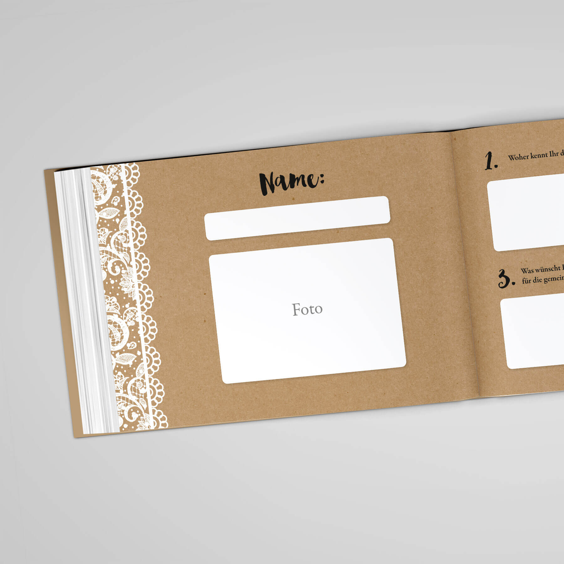 - Mit Inhalt: Die Innenseiten enthalten einen stimmungsvollen Einleitungstext sowie kreative Fragen für eure Gäste – ideal für bis zu 50 Eintragungen (Paare tragen sich häufig gemeinsam ein).