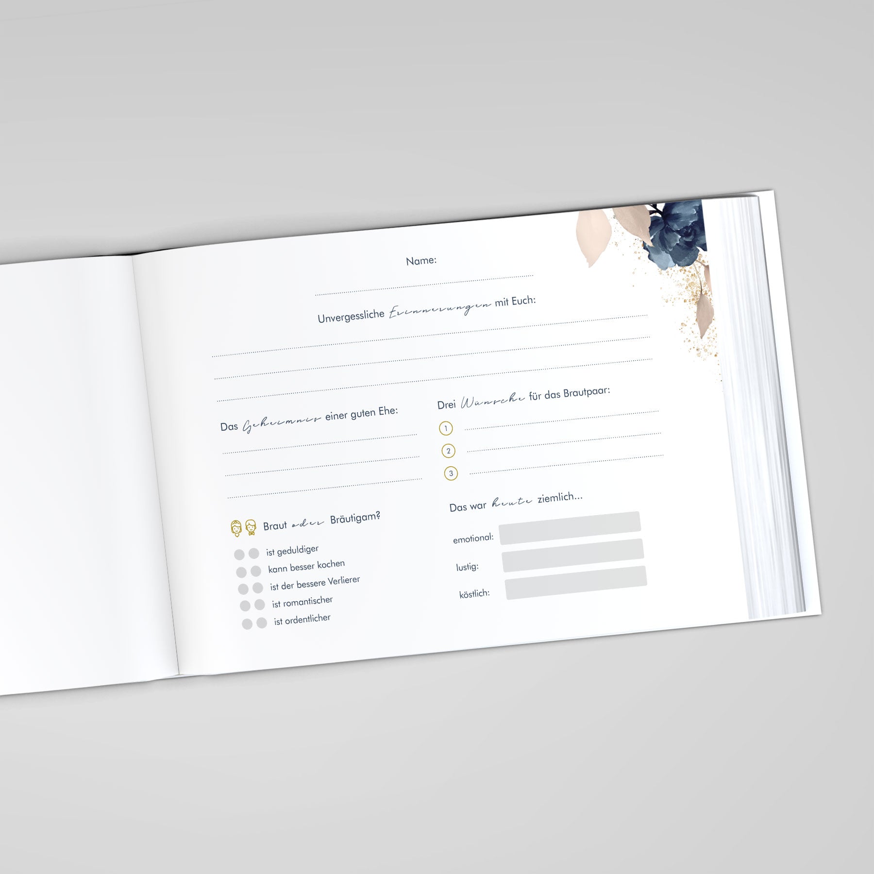 - Mit Inhalt: Die Innenseiten enthalten einen stimmungsvollen Einleitungstext sowie kreative Fragen für eure Gäste – ideal für bis zu 50 Eintragungen (Paare tragen sich häufig gemeinsam ein).